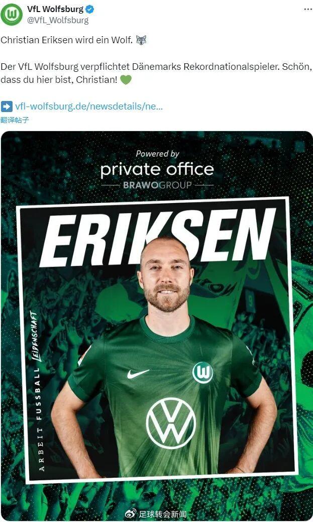 官方:沃尔夫斯堡宣布免签了埃里克森!据悉双方签下了一份2027年到期的合同。