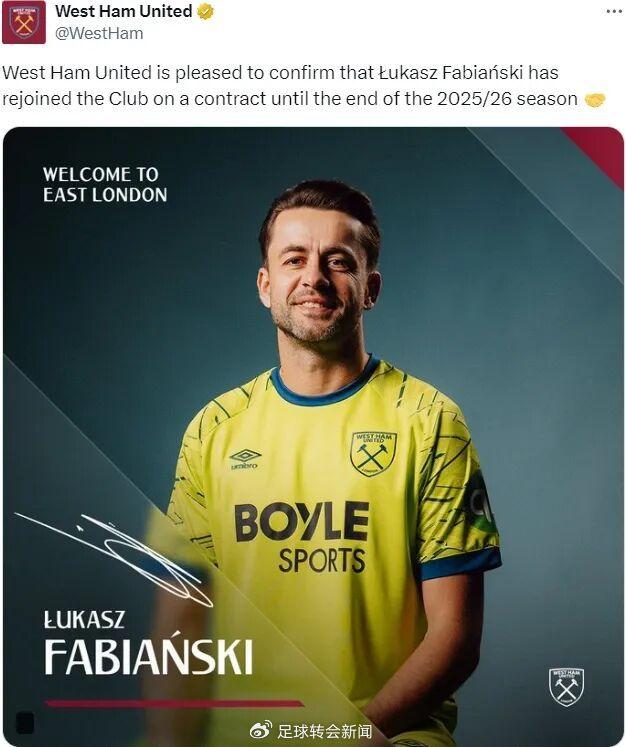 官方:西汉姆宣布签回了法比安斯基,双方签下了一份本赛季结束后到期的合同。